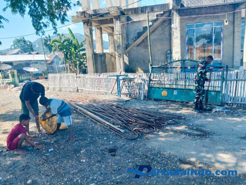 NTT-SIKKA. Babinsa Nangahale, Praka Mulyadin melaksanakan karya bakti pembersihan komplek bersama masyarakat di Desa Nangahale, Kecamatan Talibura, Kabupaten Sikka, Jumat(16/05/2025).