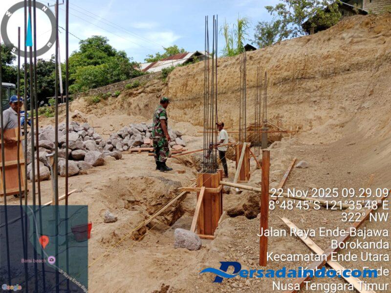 Ende — Pada hari Sabtu, 22 November 2025, perkembangan pembangunan Koperasi Desa/Kelurahan Merah Putih (KDKMP) di wilayah Kodim 1602/Ende khususnya di KDKMP Raterua terus berjalan sesuai rencana. Berlokasi di Desa Returea Kecamatan Ende Utara Kabupaten Ende, dengan titik koordinat Lat -8.8103894 dan Long 121.5956822, pekerjaan hari ini difokuskan pada kegiatan pengecoran landasan pondasi, pengecoran kolam footplat untuk tiang besi, serta lanjutan perakitan dan pengikatan besi sebagai struktur utama bangunan.