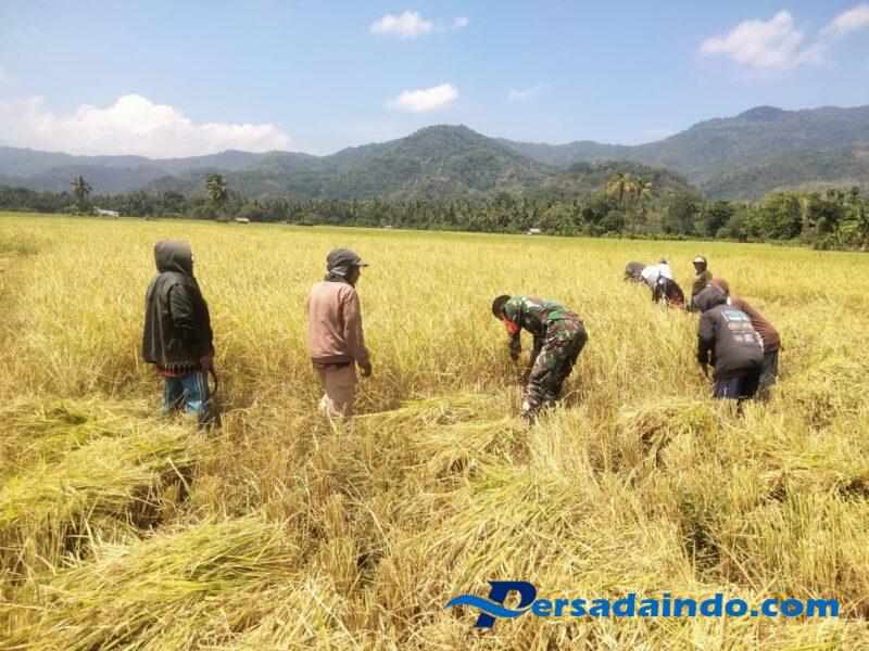 Selain panen padi, Babinsa juga melakukan Komunikasi Sosial (Komsos) dengan para petani sekaligus memantau situasi keamanan wilayah agar tetap kondusif dan aman.
