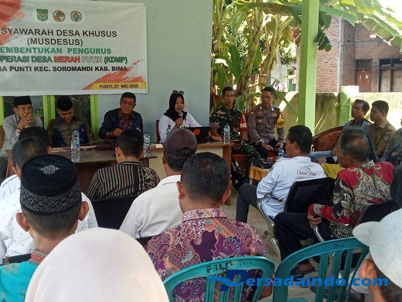 Bima, 27 Mei 2025 – Upaya memperkuat perekonomian desa kembali digelorakan melalui pembentukan Koperasi Desa Merah Putih (KDMP) di dua kecamatan di Kabupaten Bima. Pada pukul 09.30 WITA, Serka Munir, Babinsa Desa Punti Koramil 1608-05/Donggo, menghadiri rapat Musyawarah Desa Khusus (Musdessus) di Aula Kantor Desa Punti, Kecamatan Soromandi. Acara tersebut dihadiri oleh perwakilan Camat Soromandi, Kepala Desa Punti Ijman Hakim, Bhabinkamtibmas Brigpol Amrin, Ketua BPD Hamzah S.Pd, Pendamping Desa Ibu Ati S.Pd, serta tokoh agama, masyarakat, pemuda, dan wanita setempat.