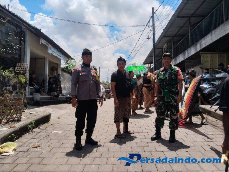Dalam rangkaian upacara tersebut, Babinsa Kelurahan Samplangan Koramil 1616-01/Gianyar, Serka I Komang Yudiartana, hadir bersama Bhabinkamtibmas Samplangan dan bersinergi dengan Pecalang Desa Adat Samplangan. Mereka bahu membahu melaksanakan pengamanan jalannya prosesi sekaligus mengatur arus lalu lintas di sekitar lokasi. Kehadiran Babinsa tidak hanya sebatas menjalankan tugas keamanan, namun juga sebagai wujud nyata kepedulian aparat kewilayahan terhadap warga yang tengah berduka.