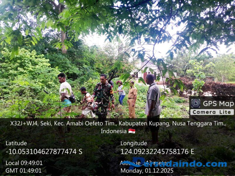 NTT-KUPANG, – Babinsa Koramil 1604-02/Camplong, Sertu Made Sutyawan melaksanakan karya bhakti bersama perangkat desa dan masyarakat setempat dalam kegiatan pembersihan lahan untuk pembangunan KDKMP di Dusun 03, RW 04, RT 07 Desa Seki, Kecamatan Amabi Oefeto Timur, Kabupaten Kupang. Kegiatan ini merupakan bentuk nyata peran Babinsa dalam mendukung percepatan pembangunan di wilayah binaan. Senin (01/12/2025).