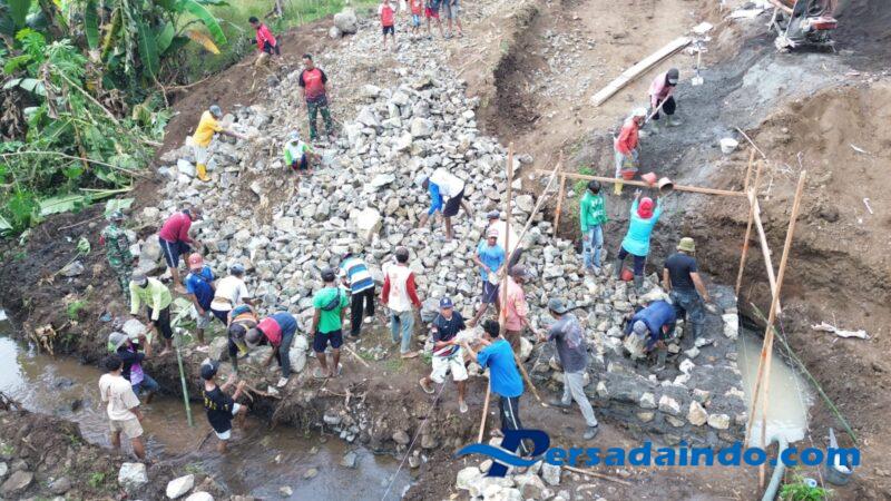 Pembangunan jembatan tersebut dimulai dengan pembuatan pondasi yang dikerjakan secara gotong royong oleh warga setempat bersama Babinsa. Kehadiran Babinsa tidak hanya sebagai bentuk pendampingan, namun juga dalam rangka memastikan kelancaran dan keamanan proses pembangunan.