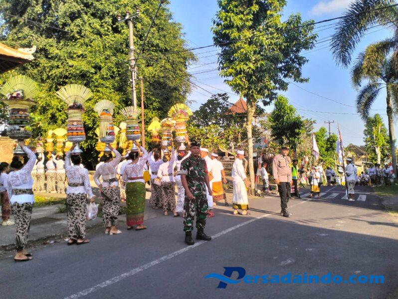 Dalam rangka Piodalan di Pura Puseh Batan Nyuh, Babinsa Desa Suwat Koramil 1616-01/Gianyar Serda Dewa Putu Dwijati Jaya bersama Bhabinkamtibmas Desa Suwat Aiptu Anak Agung Gede Agung, bersinergi dengan Pecalang melaksanakan pengamanan dan pengawalan kegiatan Meprani/Mepeed yang digelar oleh warga Pemaksan Pura Puseh Batan Nyuh, Desa Adat Suwat, Kecamatan/Kabupaten Gianyar.