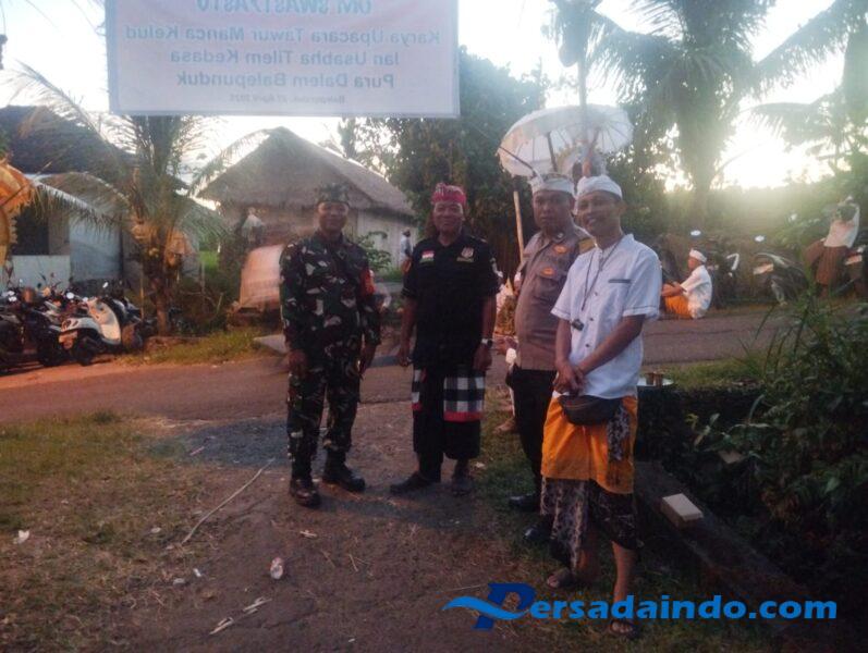 Babinsa Desa Tegalinggah Sertu I Komang Kasna mengungkapkan “kami selaku Babinsa bersama Pecalang bersinergi melaksanakan pengamanan upacara Usabe Dalem di Pura Dalem Balepunduk” terangnya.