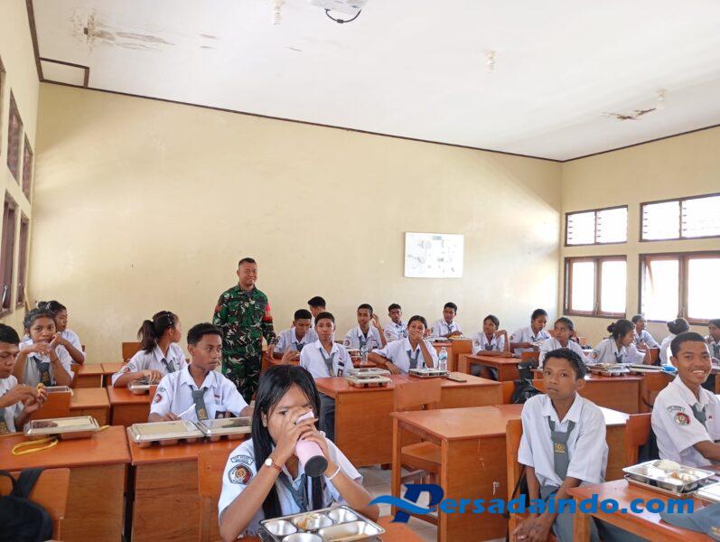 NTT-SIKKA. Dalam rangka mendukung program pemerintah untuk meningkatkan kualitas gizi bagi para pelajar, Babinsa Koramil 1603-01/Alok Kodim 1603/Sikka, Praka Aris Wijayanta, melaksanakan monitoring penyaluran program Makan Bergizi Gratis (MBG) di SMKN 1 Maumere, Rabu(17/09/2025).