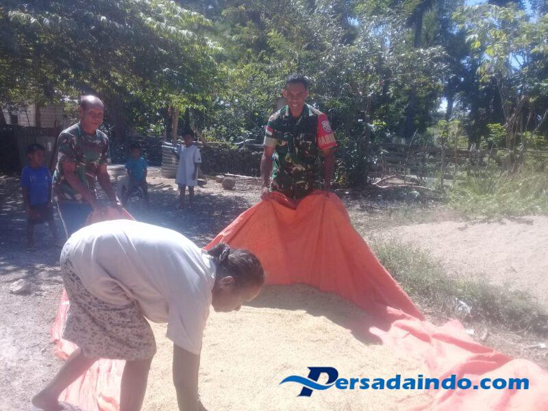 Rote Ndao,Peduli kepada warga binaa, Babinsa membantu warga menjemur padi milik Bapak Abraham Adu, Desa Tualima, Kecamatan Rote Barat Laut, Kabupaten Rote Ndao, Jumat (10/07/2025).