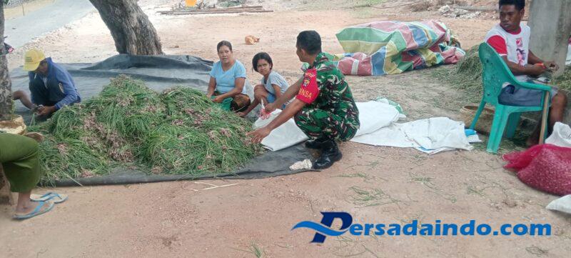 Rote Ndao, Kopda Sutrisno Babinsa Koramil 03/Batutua Kodim 1627/Rote Ndao bantu warga bersihkan bawang selesai pane, Desa Oehandi Kecamatan Rote Barat Day Kabupten Rote Ndao.Kamis (3/7/2025)