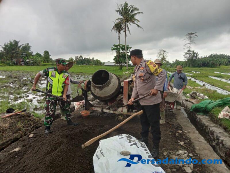 Gianyar – Suwat, (16/9/2025) Babinsa Desa Suwat Koramil 1616-01/Gianyar Serda Dewa Putu Dwijati Jaya bersama Bhabinkamtibmas Desa Suwat Aiptu Anak Agung Gede Agung mendukung kegiatan pembangunan saluran irigasi dan rabat beton jalan usaha tani di Subak Dauh Suwat, Desa Suwat, Kecamatan Gianyar.