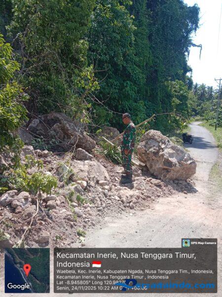 Ngada – Babinsa Koramil 1626-02/Aimere, wilayah Desa Waebela, Kecamatan Inerie, Kabupaten Ngada, melaksanakan pengecekan lokasi longsor yang terjadi di Desa Waebela. Kejadian longsor tersebut mengakibatkan tertutupnya ruas jalan penghubung Inerie – Golewa Selatan, sehingga aktivitas mobilitas masyarakat setempat terganggu.