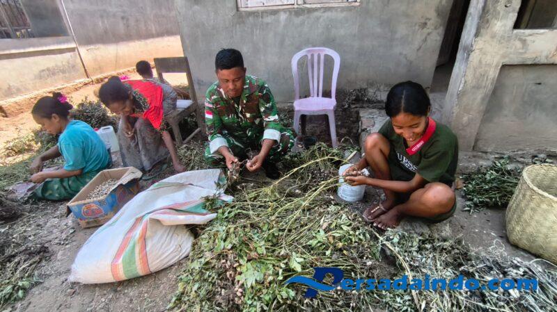 Nampak momen kebersamaan terlihat dengan penuh semangat anggota Satgaster Kodim 1605/Belu Pos Makir Sertu Obeth Nejo leki dan Serda I Wayan Suerman berbaur dengan petani untuk membantu dalam proses kegiatan memisahkan hasil panen kacang tanah dengan batangnya.