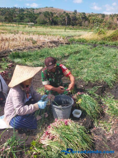 Rote Ndao – Babinsa Serka Haris Lakuy komsos dengan warga komplek persawahan Suhu Desa Lekona kecamatan pantai baru,Kabupaten Rote Ndao,Babinsa bantu membersihkan hasil panen bawang merah yang selesai di panen,Rabu (20/8/25)