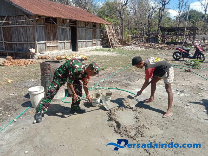 KODIM 1605/BELU, Guna terciptanya sinergitas TNI bersama rakyat, Babinsa Desa Lorotolus Koramil 1605-09/Biudukfoho Sertu Armindo Daok turut serta ikut membantu dalam proses pengerjaan pembangunan rumah warga.
