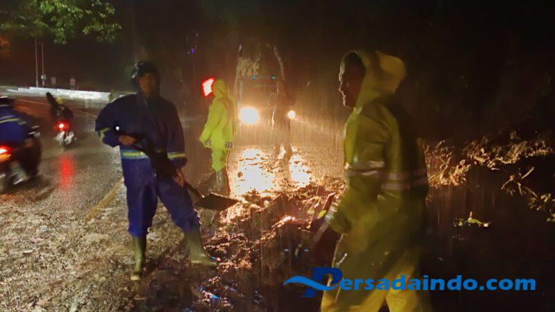 Meski kondisi sudah malam dan hujan, kami harus segera mengambil langkah cepat untuk membersihakn material tanah longsor dari jalan raya. Pasalnya jalan ini merupakan jalan utama yang padat pengguna, “terangnya.