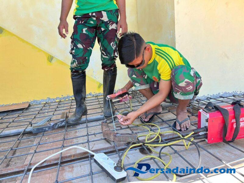 Haumeniana – Prajurit Satgas Pamtas RI-RDTL Sektor Barat Yonarhanud 2 Kostrad Pos Haumeniana mengadakan gotong royong pengecoran atap Gereja Kapela Haumeniana bersama masyarakat Desa Haumeniana, Kec. Bikomi Nilulat, Kab. TTU. Rabu (05/11)