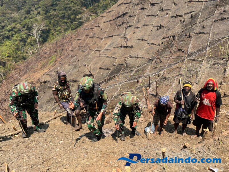 Puncak Jaya– Satgas Pamtas RI-PNG Kewilayahan Yonif 743/PSY Pos Merah Putih bersama masyarakat Kampung Ginnik bergotong royong membuka lahan kebun serta menanam bibit tanaman pangan di Kampung Ginnik, Distrik Mulia, Kab. Puncak Jaya, Papua, Kamis (18/09/25). Kegiatan ini menjadi wujud kepedulian Satgas Yonif 743/PSY dalam mendukung ketahanan pangan dan kesejahteraan warga di wilayah pegunungan Papua.