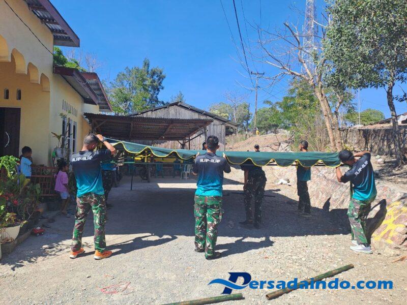 Haumeniana – Prajurit Satgas Pamtas RI-RDTL Sektor Barat Pos Haumeniana yang di pimpin oleh Danpos Sertu Moh. Amir Faisol melaksanakan kegiatan mendirikan tenda serbaguna gratis dan pemotongan hewan di rumah duka bersama masyarakat Desa Batnes, Kec. Musi, Kab. Timor Tengah Utara. Jumat (03/10).