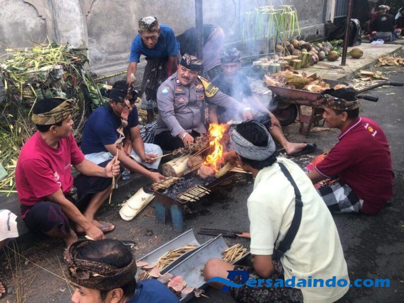 Bhabinkamtibmas Desa Singakerta Aiptu I Made Widastra menyampaikan kegiatan ngayah merupakan kegiatan gotong royong atau membantu kegiatan di wilayah binaan dalam rangka Piodalan di Pura Melanting Banjar Tewel.