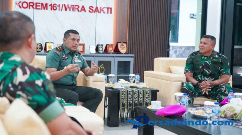 Komandan Korem 161/Wira Sakti Brigjen TNI Hendro Cahyono menerima kunjungan kerja Danpasmar 2 Brigjen TNI ( Mar ) Nanang Saefulloh.,S.E.,M.M, Dalam rangka memperkuat sinergitas antar instansi TNI, bertempat di Ruang Lobi Makorem 161/Wira Sakti Jl. W.J Lalamentik Oebufu Kota Kupang, Kamis (28/08/2025).