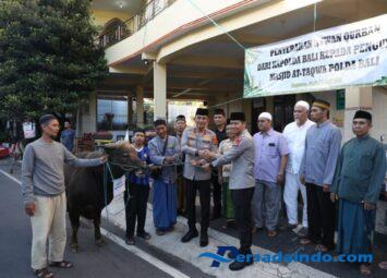 Kepala Kepolisian Daerah Bali, Irjen Pol. Daniel Adityajaya, S.H., S.I.K., M.Si. bersama Wakapolda Bali, Brigjen Pol. I Komang Sandi Arsana, S.I.K., M.H. menyerahkan sapi qurban dalam rangka hari raya...