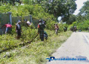 Persadaindo.com – TTS _ Babinsa Koramil 04/Amanatun Utara jajaran Kodim 1621 TTS, Sertu Yosri Tamelan bersama warga binaan bergotong royong melaksanakan pembersihan ruas kanan kiri jalan Yang d...