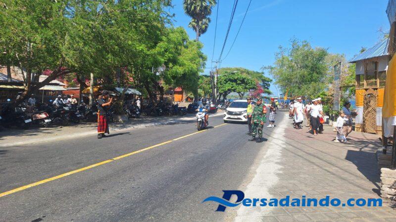 Sejak pukul 09.00 Wita, Serma Putu Sudiarsana telah berada di lokasi, tidak hanya mengawasi jalannya persembahyangan, tetapi juga fokus pada penertiban lingkungan sekitar pura yang padat oleh pemedek (umat yang bersembahyang) dan kendaraan.