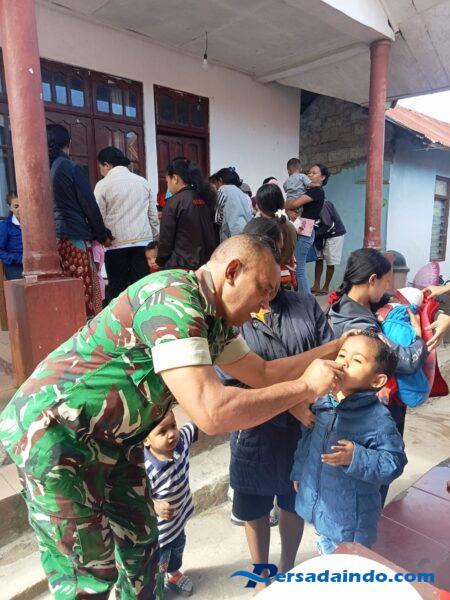SO’E _ Bintara Pembina Desa (Babinsa) Koramil 1621-01/Kota So’e Sertu Hengki Sodak melaksanakan kegiatan pendampingan pemberian bulan Vitamin A dan pemberian obat cacing bagi balita Pos Pelayanan Terpadu (Posyandu) enopetuh di kelurahan oebesa kec. Kota so’e, kab.TTS