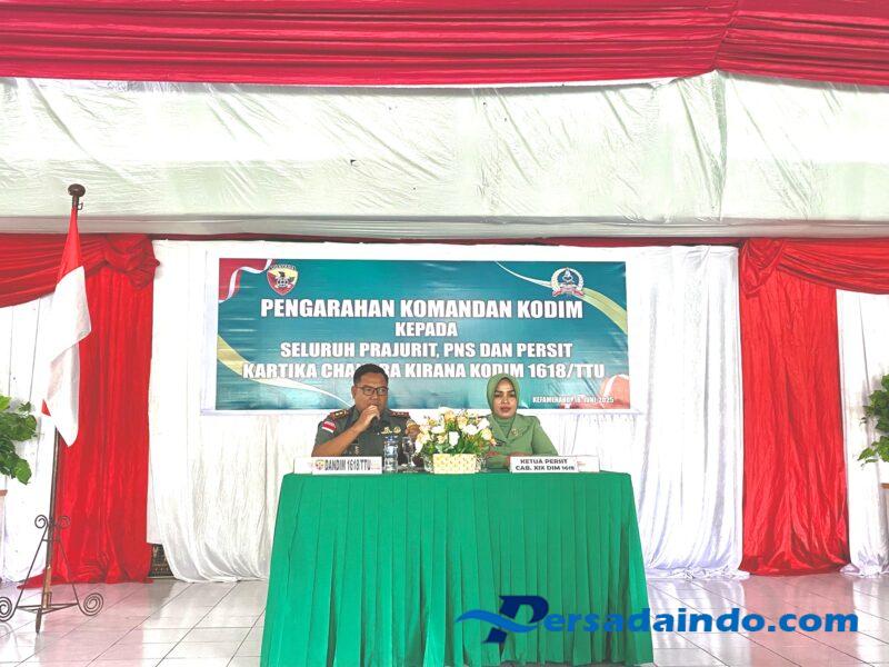 NTT-KEFAMENANU, Rabu 18 Juni 2025, BertempatAula Kodim 1618/TTU hari ini menjadi saksi berlangsungnya pengarahan penting yang dipimpin langsung oleh Dandim 1618/TTU Letkol Arm Didit Prasetyo Purwanto, S.E., didampingi Ketua Persit KCK Cabang XIX Dim 1618 Ny. Sherly Didit Prasetyo P. Kegiatan ini dihadiri seluruh prajurit, ASN, dan anggota Persit Kartika Chandra Kirana Cabang XIX Dim 1618., sebagai bentuk pembinaan menyeluruh terhadap ketahanan keluarga dan profesionalisme aparat kewilayahan.