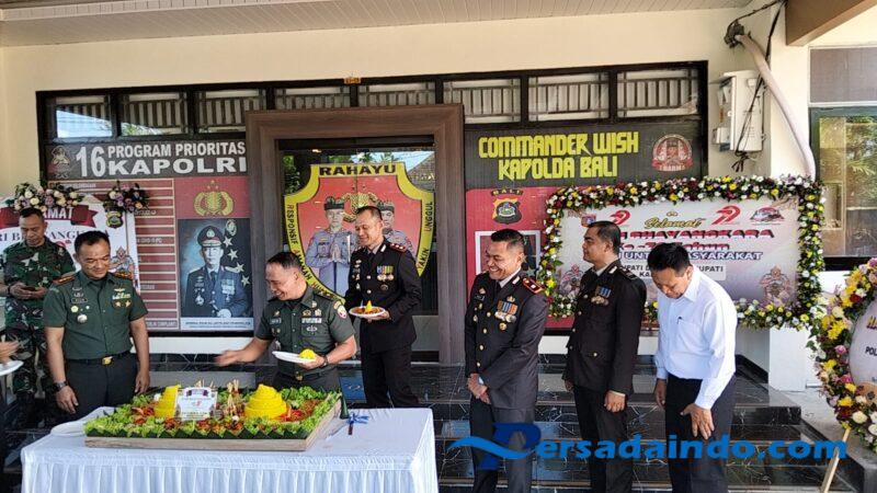 Komandan Kodim 1623/Karangasem Letkol Czi Ryan Yustian,SE,.M.HAN, bersama Kasdim dan Perwira Staf selanjutnya mengucapkan HUT Bhayangkara ke 79, dan menyerahkan Tumpeng serta melakukan pemotongan Tumpeng oleh Dandim 1623/Karangasem di dampingi Kapolres Karangasem.