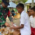 Satgas Pamtas RI–RDTL Sektor Timur Yonarmed 12 Kostrad melalui Pos Maubusa melaksanakan kegiatan pembagian bubur kacang hijau kepada para sisw...