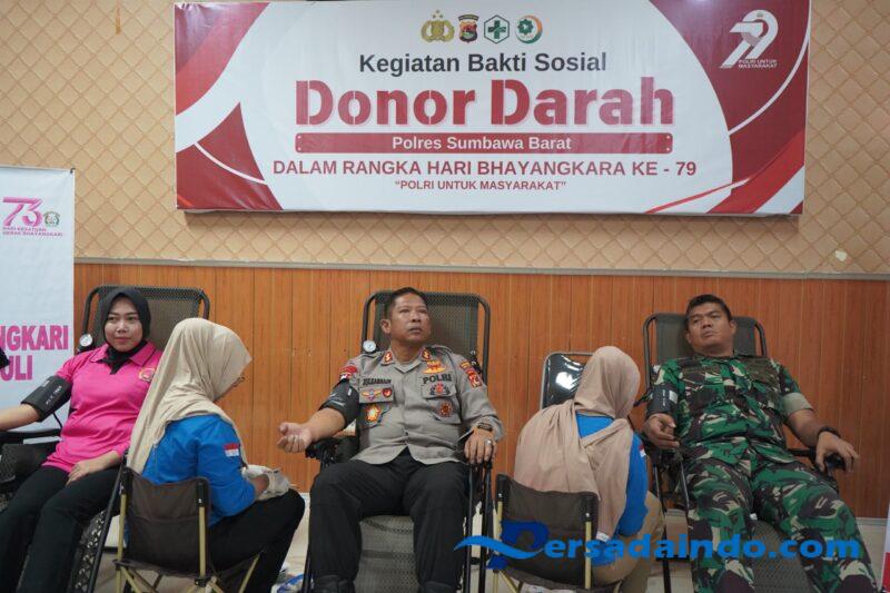 Zulkarnaen S.I.K. Dandim 1628/Sumbawa Barat Letkol Inf Andri Karsa S.Sos M.Han. Ibu Ketua Cabang Bayangkari Polres Sumbawa Barat Ny dr. Dian Zulkarnaen. Pejabat Utama Polres Sumbawa Barat. Para Pengurus Cabang Bayangkari Polres Sumbawa Barat. Para peserta donor darah dalam rangka peringatan hari bhayangkari Ke-79.