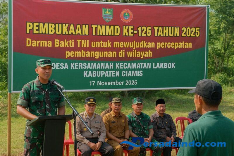 Ciamis – Kodim 0613/Ciamis resmi membuka pelaksanaan TMMD ke-126 tahun 2025 di Desa Kersamanah, Kecamatan Lakbok, Ciamis, Senin (17/11/2025). Kegiatan tersebut dibuka langsung oleh Dandim 0613/Ciamis Letkol Inf Asep Kelanajaya dan turut dihadiri para pejabat Forkopimda Kabupaten Ciamis.