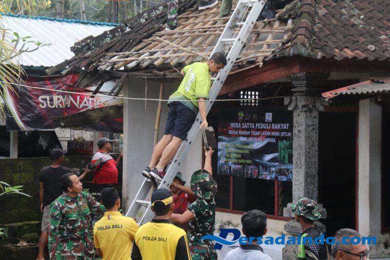 Tampak dalam pantauan, dengan naik tangga Letkol Armen terlihat begitu semangat berbaur untuk menurunkan atap rumah ibu Wayan Ngeni.