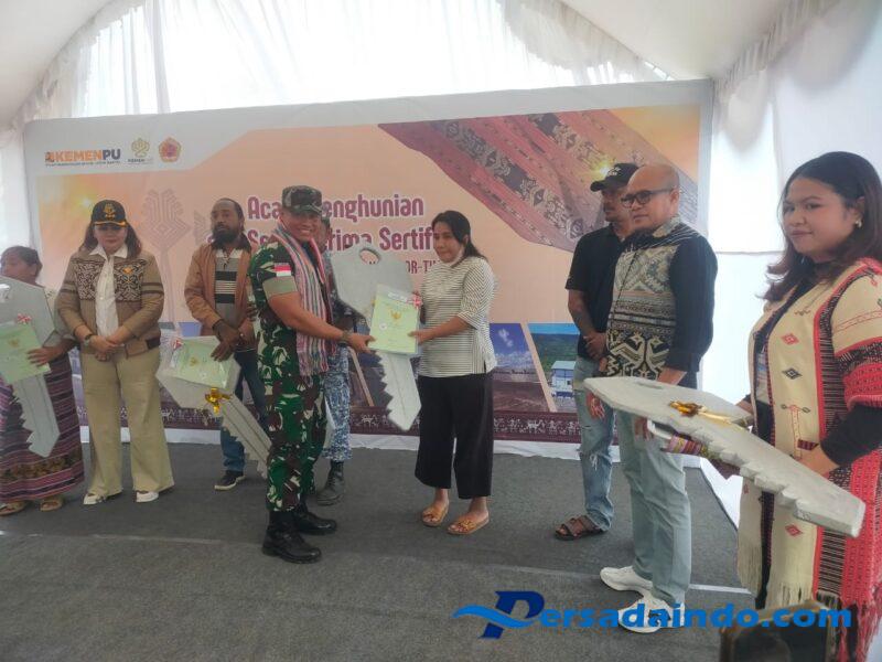 NTT-KUPANG, – Dandim 1604/Kupang Kolonel Inf Kadek Abriawan, S.I.P., M.H.I mendampingi Bupati Kupang Yosef Lede, S.H menyerahkan secara simbolis kunci rumah dan sertifikat kepada 324 penerima manfaat rumah khusus Eks Pejuang Timor-Timur. Acara berlangsung di Jln. Timor Raya Km. 41 Desa Oebola Dalam, Kecamatan Fatuleu, Kabupaten Kupang, pada Sabtu (20/09/2025).