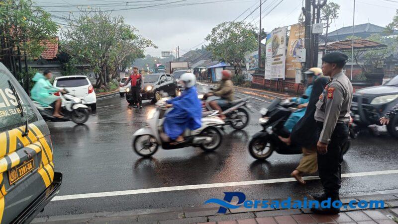 ABIANSEMAL – Meskipun cuaca kurang bersahabat dan diguyur hujan, Personel Polsek Abiansemal tetap melaksanakan tugas pengaturan lalu lintas di sejumlah titik rawan kepadatan pada sore hari, Sabtu sore (5/7/2025).