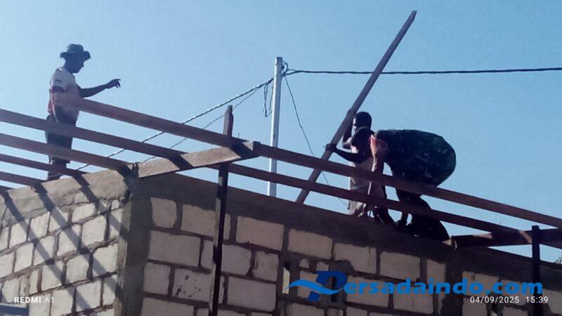 Suasana gotong royong terlihat penuh semangat. Warga, tua maupun muda, bekerja bersama-sama mengangkat bahan bangunan, memegang kayu, hingga memasang seng di bawah arahan tukang berpengalaman. Canda tawa terdengar di sela-sela pekerjaan, menambah suasana akrab di tengah aktivitas pembangunan.