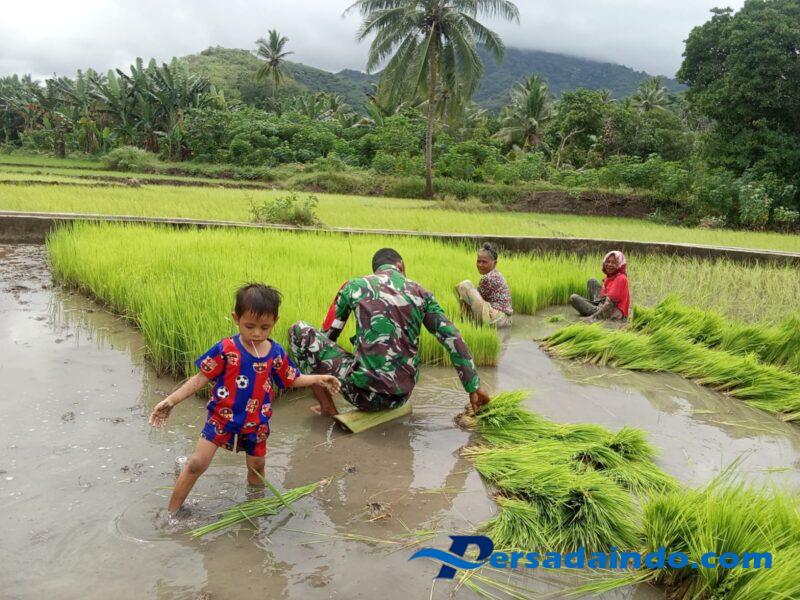 NTT-SIKKA Babinsa Koramil 1603-03/Paga, Kodim 1603/Sikka Pratu Eman Manehat, melaksanakan kegiatan pendampingan pemanenan anakan bibit padi di Desa Aebubu, Kecamatan Paga, Kabupaten Sikka. Kegiatan ini merupakan bagian dari upaya mendukung ketahanan pangan dan meningkatkan produksi pertanian di wilayah tersebut, Jumat(13/06/2025).