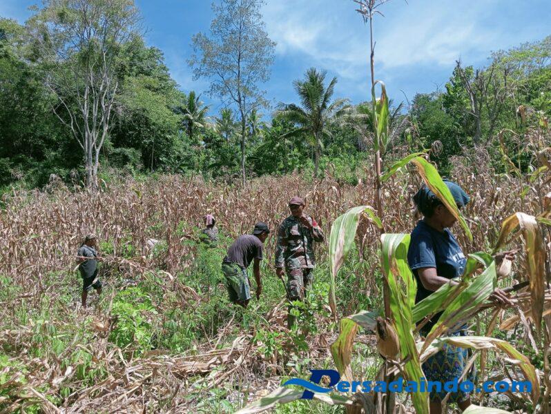 TTS – Babinsa Koramil 02 Abanteng Jajaran Kodim 1621 TTS, Serka Okri Bano membantu petani dalam memanen jagung di lahan milik salah Warga Binaan Imanuel Nautani salah Seorang petani di desa Pana kecamatan Kolbano, kabupaten Timor Tengah Selatan, Selasa (21/04/2025)