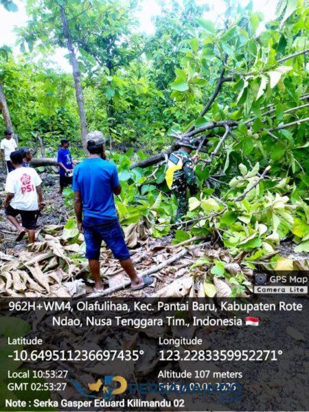 Babinsa Koramil Pantai Baru, Kodim 1627/Rote Ndao, melaksanakan kegiatan pembersihan lokasi pembangunan KDKMP bersama masyarakat di Desa Lekona, Kecamatan Pantai Baru, Kabupaten Rote Ndao, Jumat (9/1/2026).
