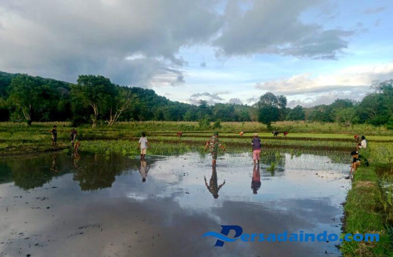 NTT- Sumba Timur,Babinsa Koramil 06/Karera, Kodim 1601/Sumba Timur, Serka Dominggus Lay menunjukkan kepeduliannya terhadap kesejahteraan para petani dengan turun langsung ke sawah membantu proses penanaman padi.