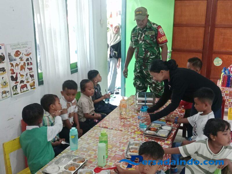 Ende, Dalam rangka mendukung program pemerintah tentang pemberian makan siang bergizi bagi anak sekolah, Babinsa Koramil 1602-01/Ende melaksanakan kegiatan pembagian makan bergizi gratis kepada siswa-siswi TK KARTIKA VII-8 yang berlokasi di Kelurahan Kotaraja, Kecamatan Ende Utara, Kabupaten Ende, Senin (21/7).