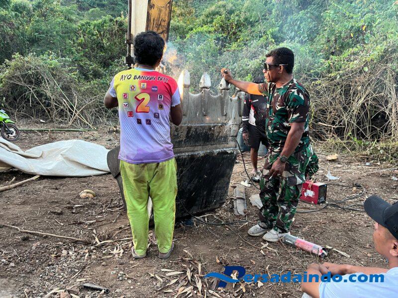 Alor – Pelaksanaan TNI Manunggal Membangun Desa (TMMD) ke-125 Kodim 1622/Alor kembali berjalan optimal setelah baket ekskavator yang sebelumnya mengalami kerusakan kini berhasil diperbaiki. Perbaikan dilakukan melalui proses pengelasan menggunakan alat las dan plat baja yang didatangkan secara khusus dari Kalabahi.