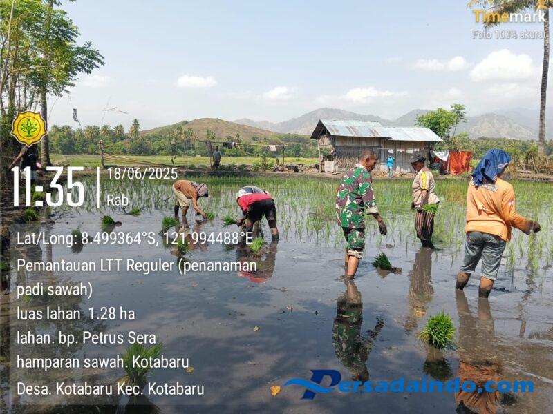 NTT – Ende/KotaBaru, Dalam semangat kemanunggalan TNI dengan rakyat, Bintara Pembina Desa (Babinsa) Koramil 04/Maurole, Sertu Densius Berno, turun langsung ke sawah membantu proses penanaman padi walaupun Erupsi di wilayah binaanya Babinsa dan warga tetap menanam bibit padi bersama Koordinator BPP dan Poktan Sanmico, di Desa Kota Baru, Kecamatan Kecamatan Kota Baru, Kabupaten Ende, Rabu (18/06/2025).