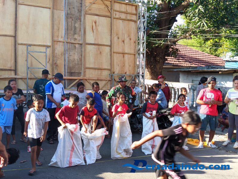 NTT-KUPANG, – Dalam rangka memperingati Hari Ulang Tahun ke-80 Republik Indonesia, Babinsa Kelurahan Merdeka Koramil 1604-01/Kupang, Sertu Soleman Missa bersama Babinkamtibmas Aipda Heron Ndiwa turut hadir memeriahkan sekaligus melakukan pengamanan kegiatan lomba anak-anak di Kelurahan Merdeka, Kecamatan Kota Lama, Kota Kupang. Berbagai perlombaan digelar, mulai dari balap sepeda, gigit sendok, lari karung, memasukkan paku ke dalam botol, hingga tarik tambang yang diikuti dengan penuh antusias oleh anak-anak setempat. Sabtu (16/08/2025).