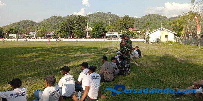 Sumbawa Barat, NTB – Babinsa Desa Belo, Koramil 1628-05/Jereweh, Serda Sukardin bersama anggota Koramil melaksanakan pengamanan Open Turnamen Kades Cup I Desa Belo Tahun 2025 yang berlangsung di Lapangan Bola Lalu Magaparang, Desa Belo, Kecamatan Jereweh.