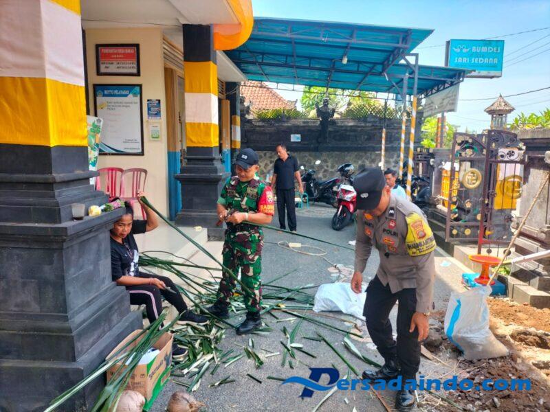 Klungkung, – Dalam rangka mensukseskan upacara keagamaan, Babinsa Balas Koramil 1610-02/Banjarangkan Serka Wayan Rata bersama perangkat desa melaksanakan gotong royong persiapan upacara keagamaan di halaman kantor Desa Bakas, Kecamatan/Kabupaten Klungkung, Selasa ( 28/10/25 ).