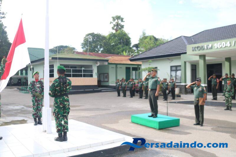 KUPANG-NTT – Personil jajaran Kodim 1604/Kupang baik militer maupun PNS melaksanakan upacara pengibaran bendera Merah Putih mingguan, bertempat di Lapangan Upacara Makodim, Jl. Muhammad Hatta, Kelurahan Fontein, Kecamatan Oebobo, Senin (01/12/2025).