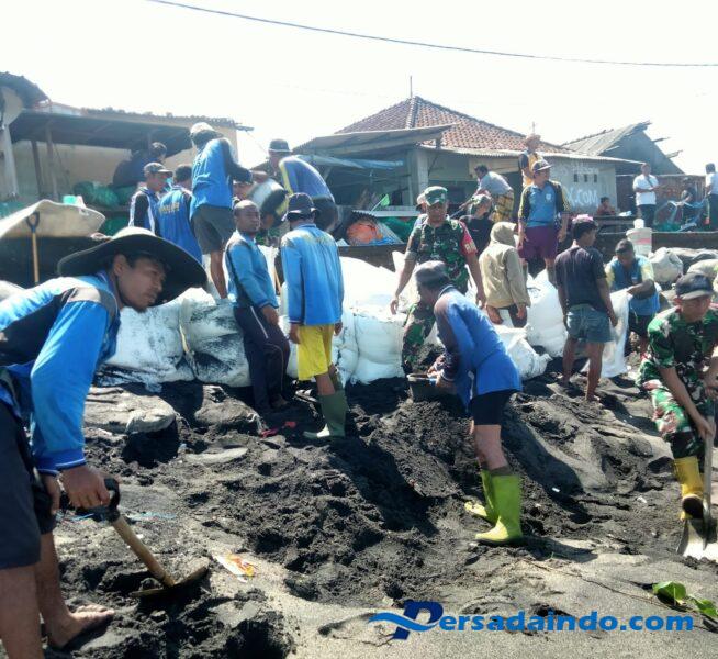 Bintara Pembina Desa (Babinsa) Kelurahan Bintaro, Komando Rayon Militer (Koramil) 1606-09/Ampenan bersama masyarakat dan pihak terkait bahu-membahu melakukan pengisian pasir Geobag sebagai penahan gelombang sekaligus penimbunan jalan yang rusak akibat abrasi beberapa hari lalu.
