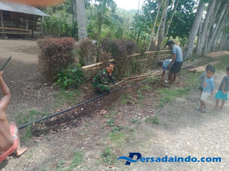 SUMBA BARAT – Babinsa Koramil 01/Loli Kodim 1613/Sumba Barat, Sertu Mursidi, bersama warga masyarakat melaksanakan kegiatan gotong royong menanam pipa sumur bor di Desa Manola, Kecamatan Loli, Kabupaten Sumba Barat, Rabu (17/9/2025).