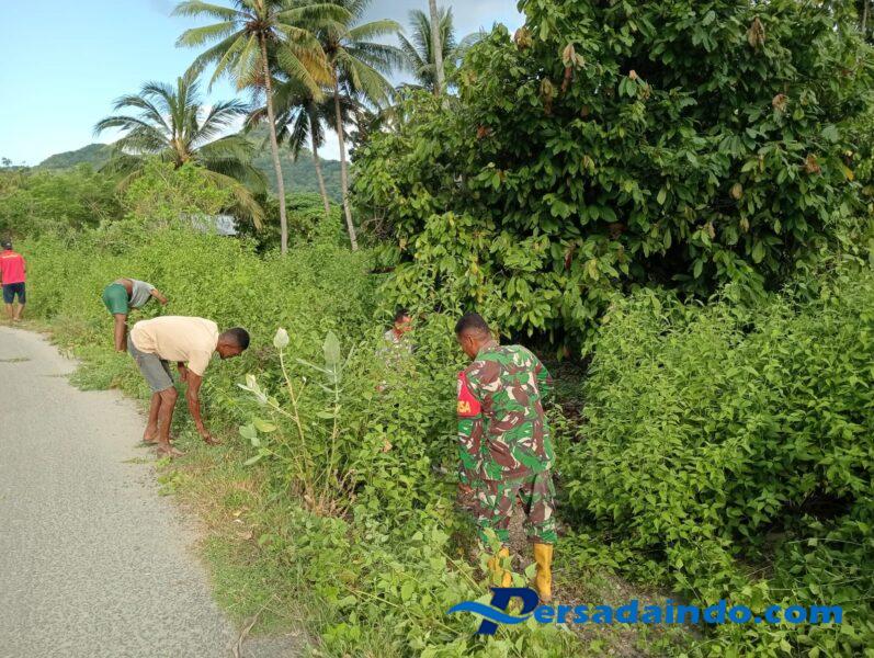 NTT – Ende/Maurole, Babinsa Koramil 04/Maurole Sertu Donatus Kiri bersama Kepala Desa Uludala serta warga masyarakat setempat menggelar kegiatan gotong royong untuk membersihkan rumput liar di bahu Jalan Trans Utara , Kecamatan Maurole Kabupaten Ende, Jumat (13/06/2025).